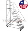 Escalera de Acero, con 4 ruedas de gran calidad, 2 fijas y 2 giratorias con freno para mayor seguridad. Ideal para trabajos en altura, cuenta con barandal de apoyo y peldaños de malla antideslizantes.